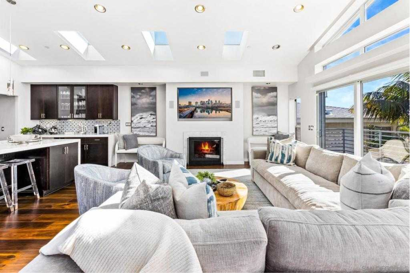 The rooftop deck, complete with a gas fireplace and bar seating, offers panoramic views of the San Diego skyline and bay.