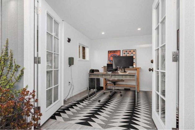 The open-concept design and three sets of French doors seamlessly connect the living area to the lush backyard, embracing the true Southern California indoor-outdoor lifestyle.
