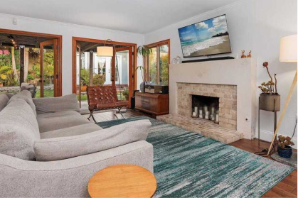 The open-concept design and three sets of French doors seamlessly connect the living area to the lush backyard, embracing the true Southern California indoor-outdoor lifestyle.