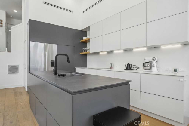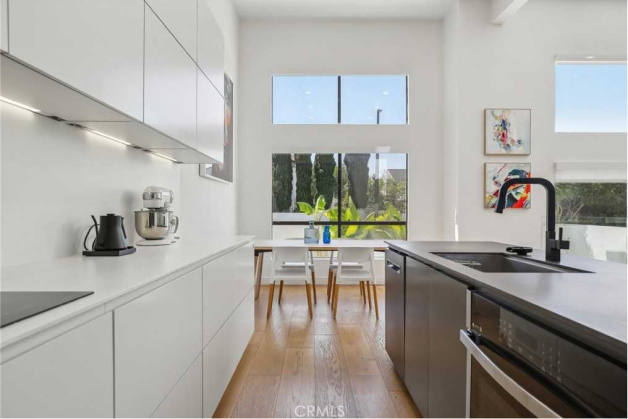 The kitchen showcases modern minimalist design, complete with sleek cabinetry, a generous center island, and energy-efficient stainless-steel appliances.