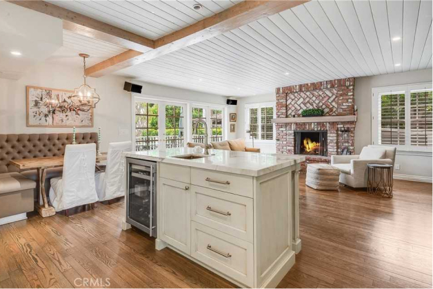 It flows directly into the cozy family room, complete with a charming brick fireplace and a built-in breakfast booth—ideal for casual meals and morning coffee.