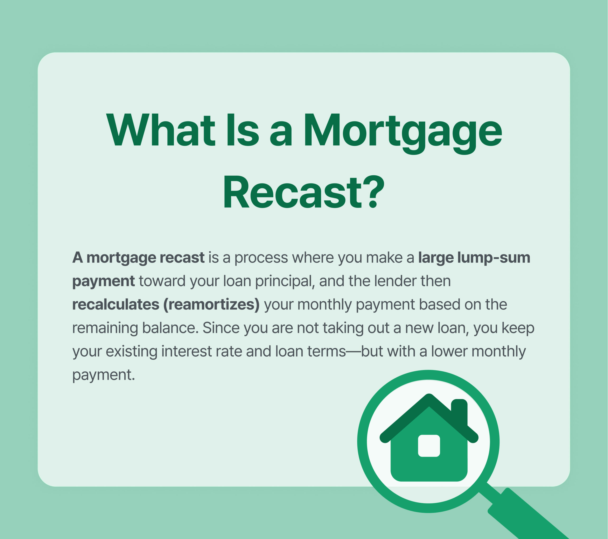 A mortgage recast is a process where you make a large lump-sum payment toward your loan principal, and your lender then recalculates (reamortizes) your monthly mortgage payment based on the reduced balance.