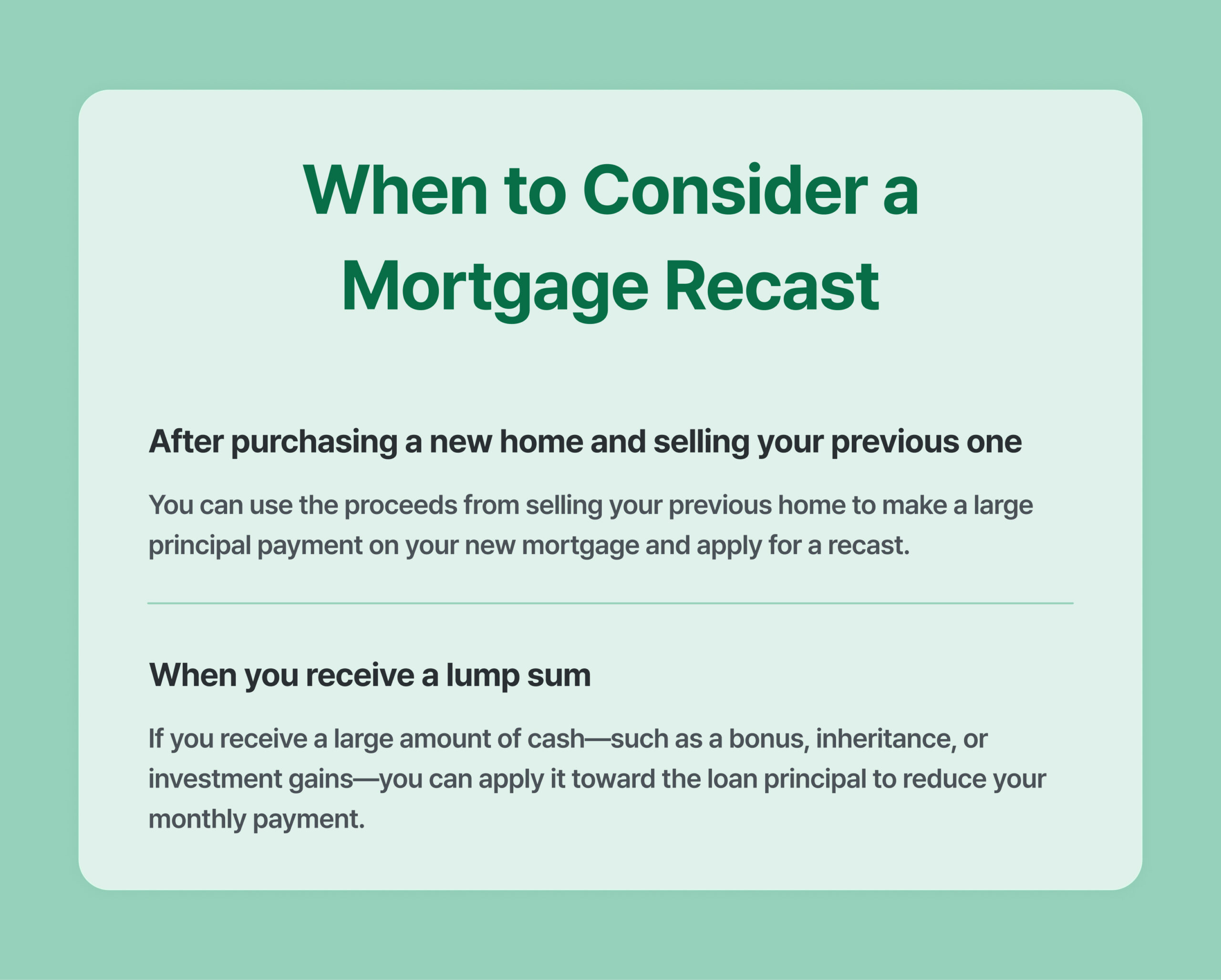 If you purchased a new home before selling your old one, you can use the sale proceeds to pay down your mortgage principal and recast your loan.