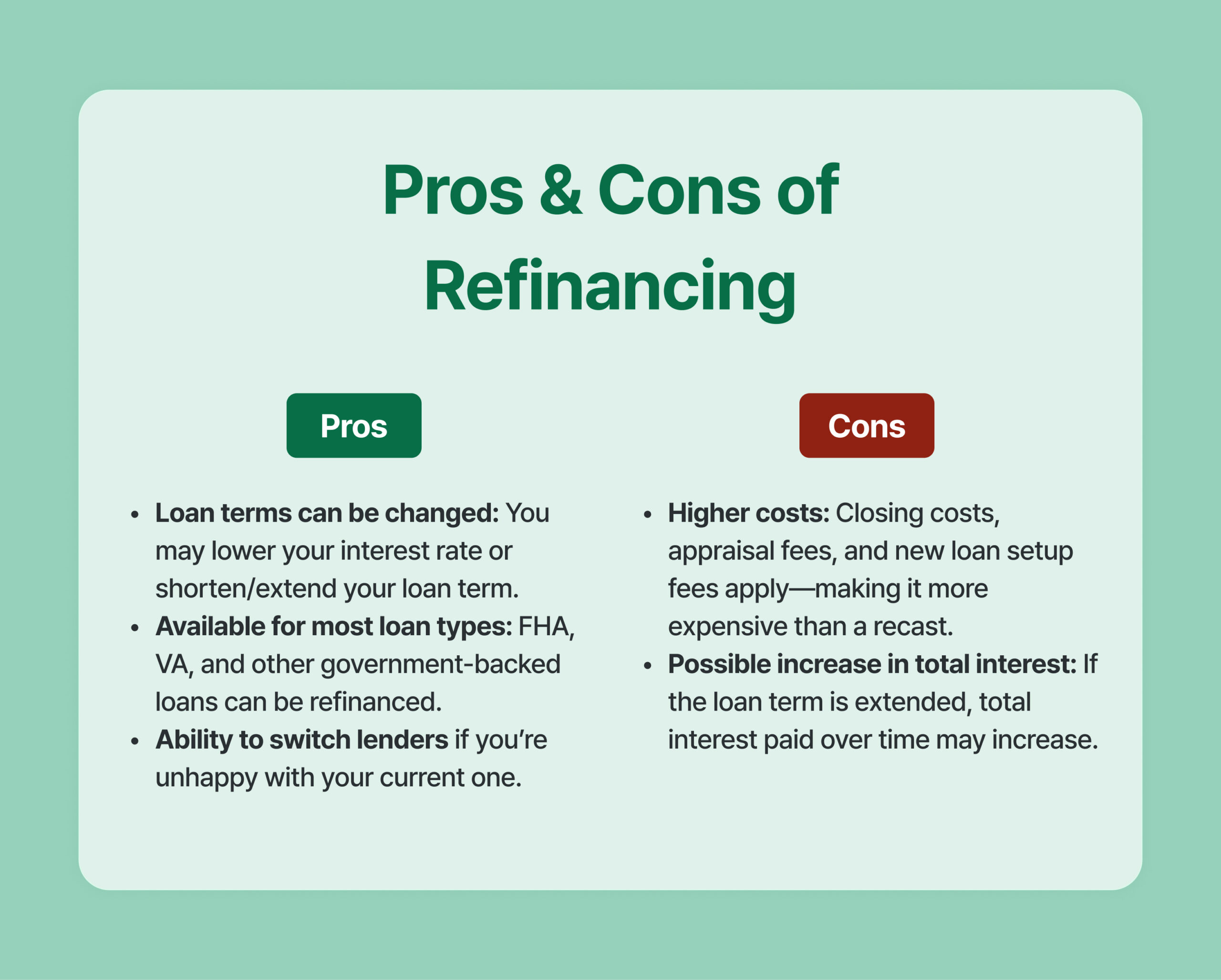 - Higher costs: Refinancing involves closing costs, appraisal fees, and new loan setup fees, making it significantly more expensive than recasting.