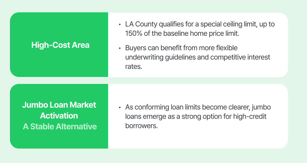 This means loans up to approximately $1.25 million can now qualify for conforming guidelines—often offering lower interest rates and less stringent underwriting compared to jumbo loans. For buyers considering homes above $1 million, this is a major advantage in both rate savings and approval flexibility.