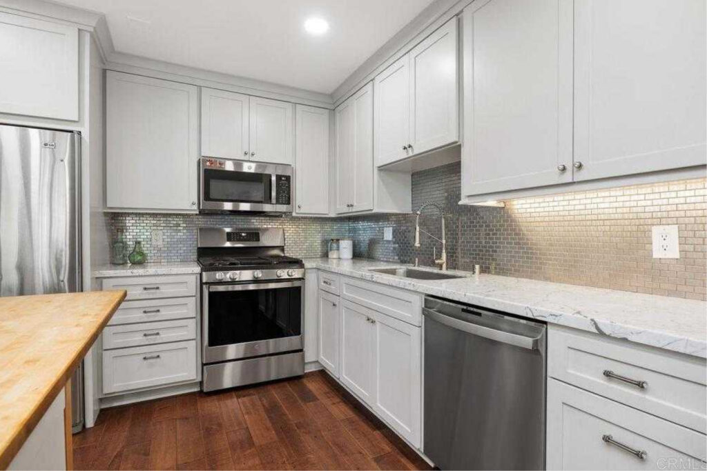 리모델링된 주방은 셰이커 스타일의 화이트 캐비닛과 스테인리스 타일 백스플래시, 그리고 이동식 아일랜드로 완성되어 세련된 분위기와 효율성을 모두 잡았습니다.