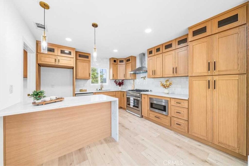 고급 쿼츠 조리대와 스테인리스 스틸 가전제품이 완비되어 있으며, 디자이너 감성의 조명과 백스플래시가 돋보이는 고급스러운 분위기입니다.