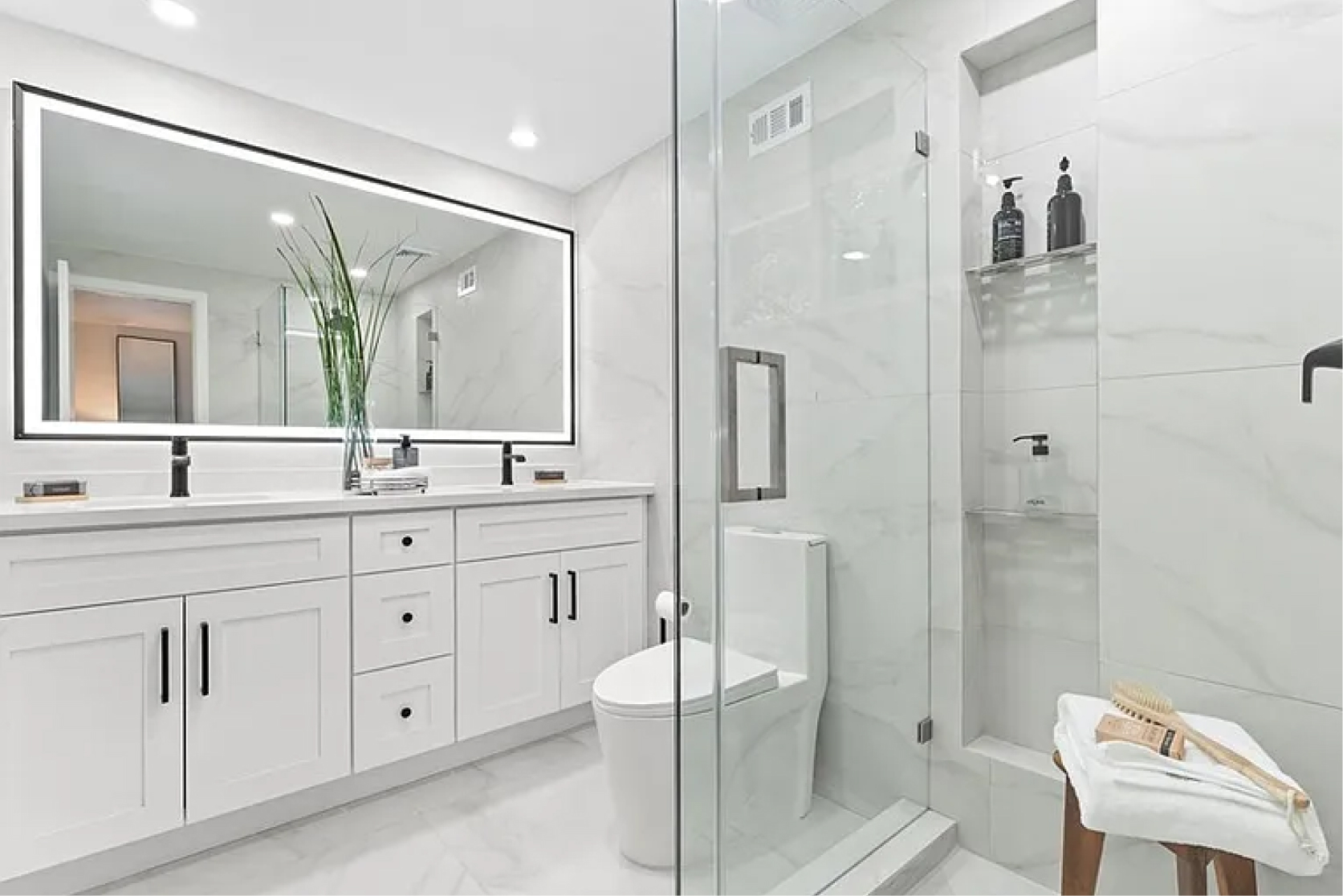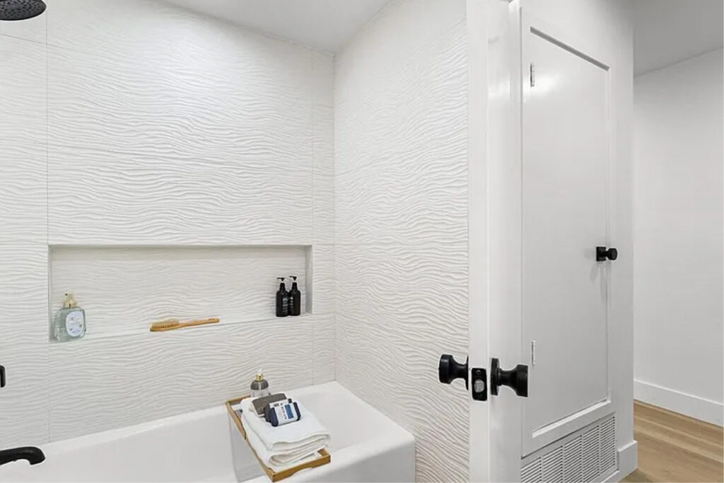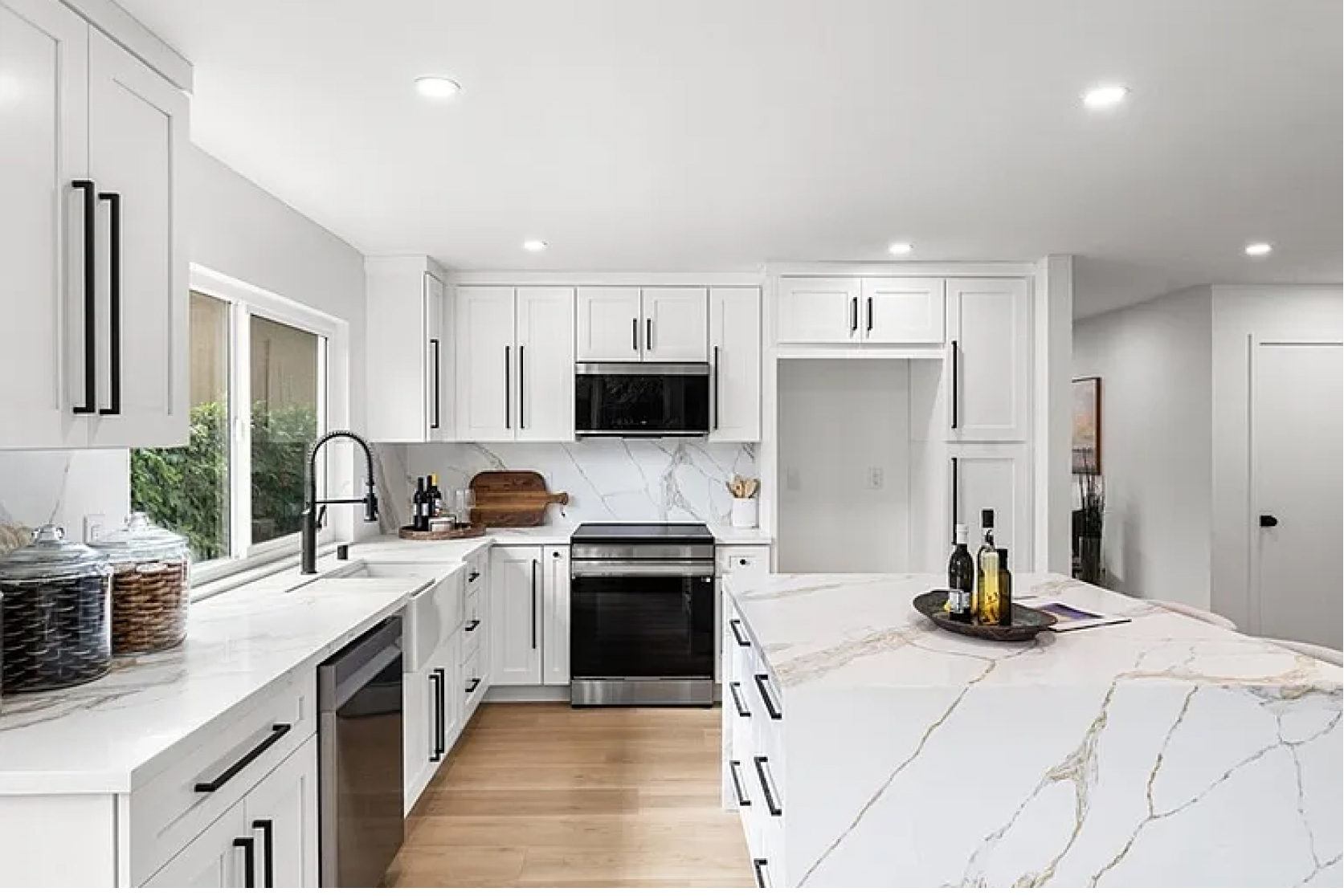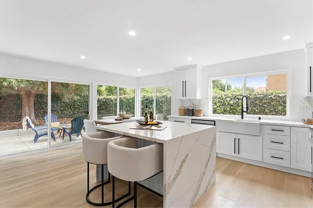주방은 쿼츠 폭포식 아일랜드, 맞춤형 캐비닛, 스테인리스 빌트인 가전제품으로 완성되었습니다. 4인용 바 아일랜드는 가족 식사나 홈파티에 적합하며, 디자이너 타일 백스플래시와 블랙 하드웨어로 세련된 포인트를 더했습니다.