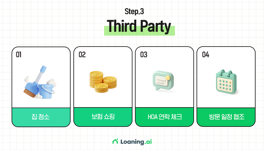 지금 내 집이 Third Party 단계에서 어떻게 평가되고 있는지, 감정평가·타이틀·보험 일정이 계획대로 진행되고 있는지 궁금하시다면, Loaning.ai 담당자에게 Third Party 진행 현황을 문의해 보세요. 안전한 거래를 위한 모든 과정을 함께 점검해 드리겠습니다.