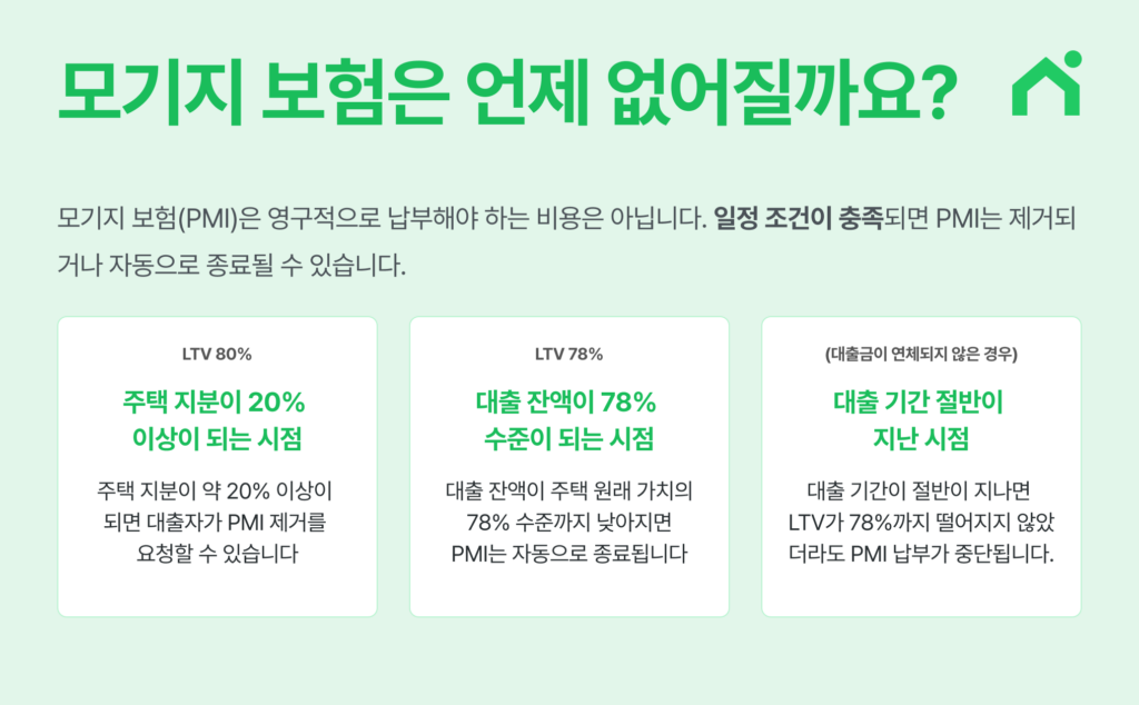 모기지 보험(PMI)은 영구적으로 납부해야 하는 비용은 아닙니다. 일정 조건이 충족되면 PMI는 제거되거나 자동으로 종료될 수 있습니다.