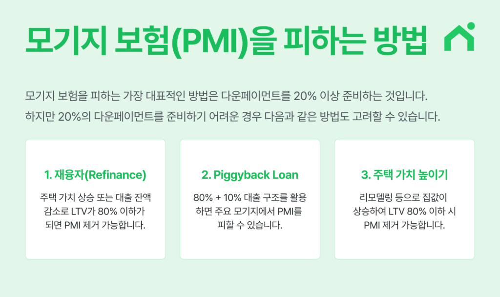 모기지 보험을 피하는 가장 대표적인 방법은 다운페이먼트를 20% 이상 준비하는 것입니다. 이 경우 일반적인 컨벤셔널 모기지에서는 PMI가 요구되지 않는 경우가 많습니다.