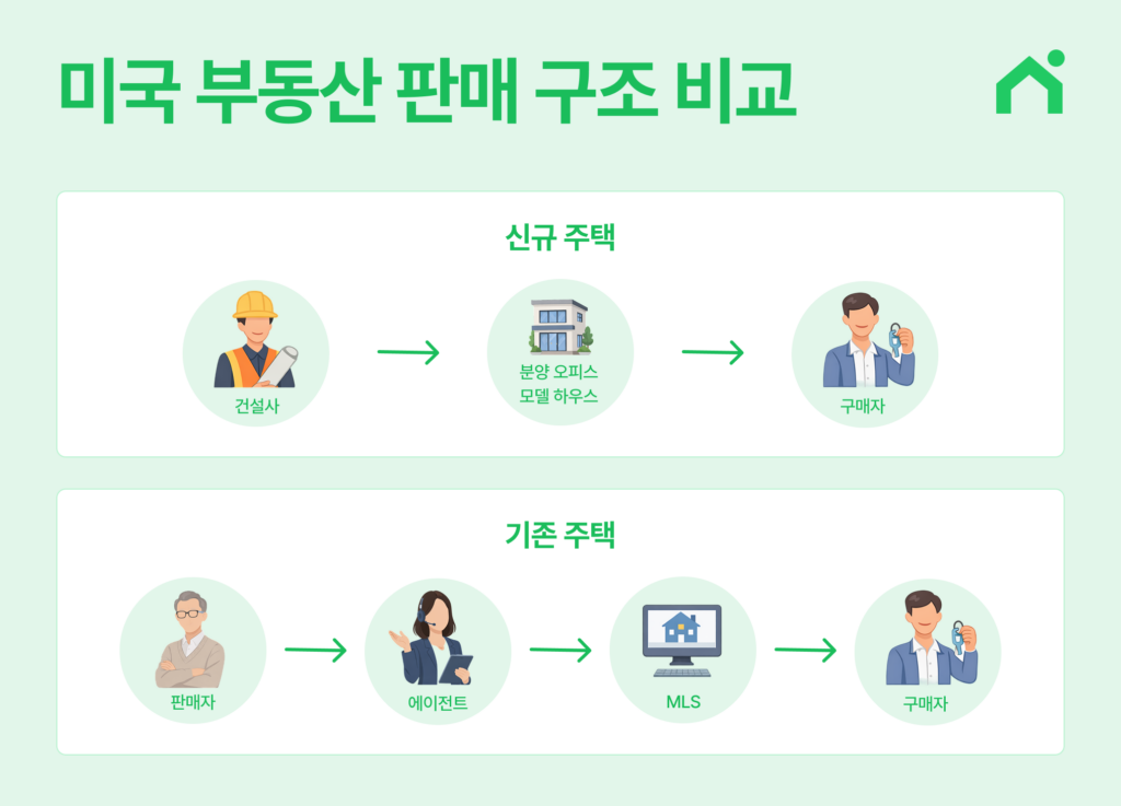 위 구조는 미국 부동산 시장에서 일반적으로 나타나는 판매 흐름을 단순화해 설명한 것입니다. 실제 거래 과정은 상황에 따라 달라질 수 있습니다.