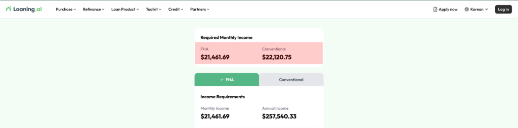 이 기준을 빠르게 확인할 수 있는 방법으로 Loaning.ai의 Income Calculator를 활용해볼 수 있어요.