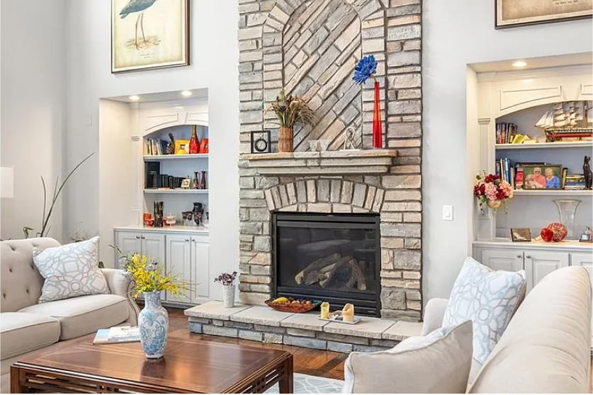 - 거실: 웅장한 현관을 지나면 2층 높이의 천장이 특징인 패밀리룸이 나타납니다. 이 공간은 천장까지 이어지는 스톤 벽난로가 중심에 자리 잡고 있어 따뜻하고 고급스러운 분위기를 제공합니다. 키핑룸에는 또 다른 스톤 벽난로가 있어 가족들이 함께 시간을 보내기에 적합한 아늑한 공간을 제공합니다. 이 공간은 자연광이 가득 들어오는 대형 창문으로 더욱 밝고 쾌적한 환경을 자랑합니다.